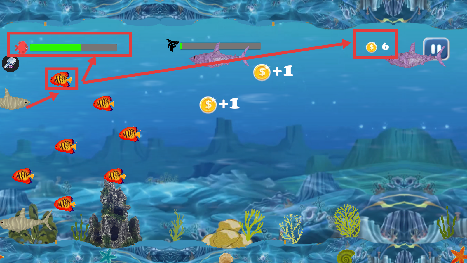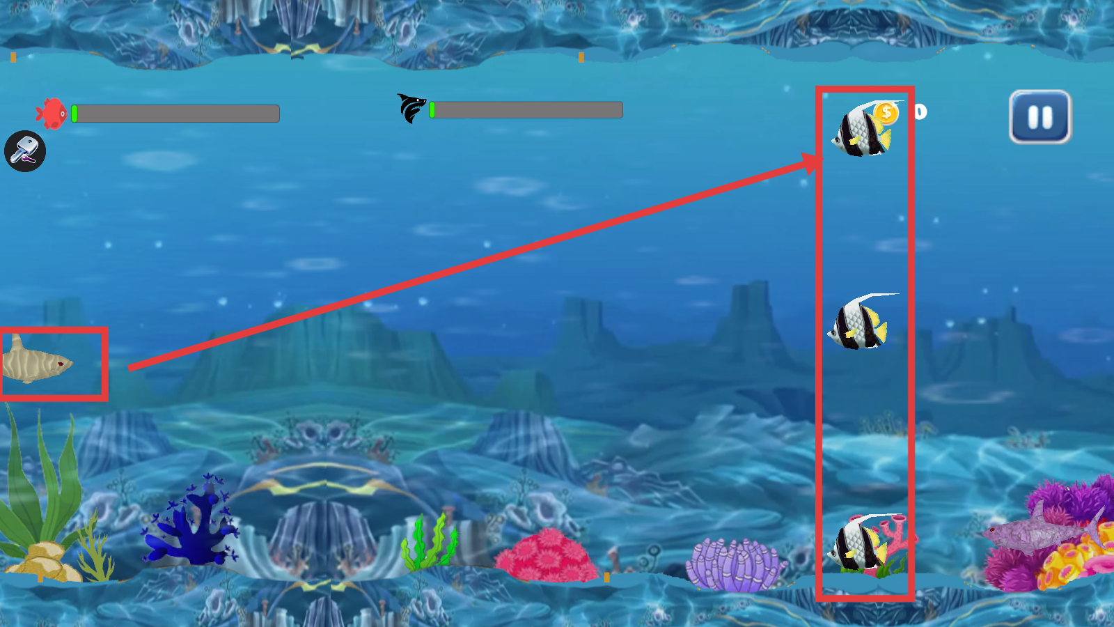 2、操控鲨鱼瞄准右侧带金币的鱼进行捕食,同时注意上方的进度条变化,合理规划移动路径。