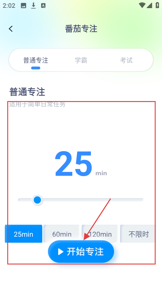 2、番茄专注页选【普通专注】,时长可选25min、60min等,选好点【开始专注】,超方便。