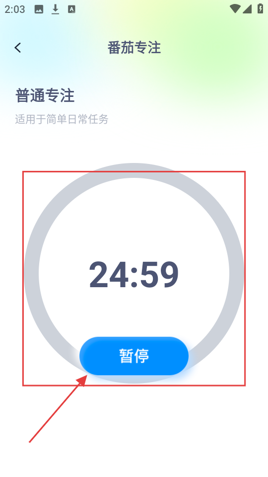 3、专注开始后,能看到倒计时,要是有事,点【暂停】,就能暂时停止专注计时啦。