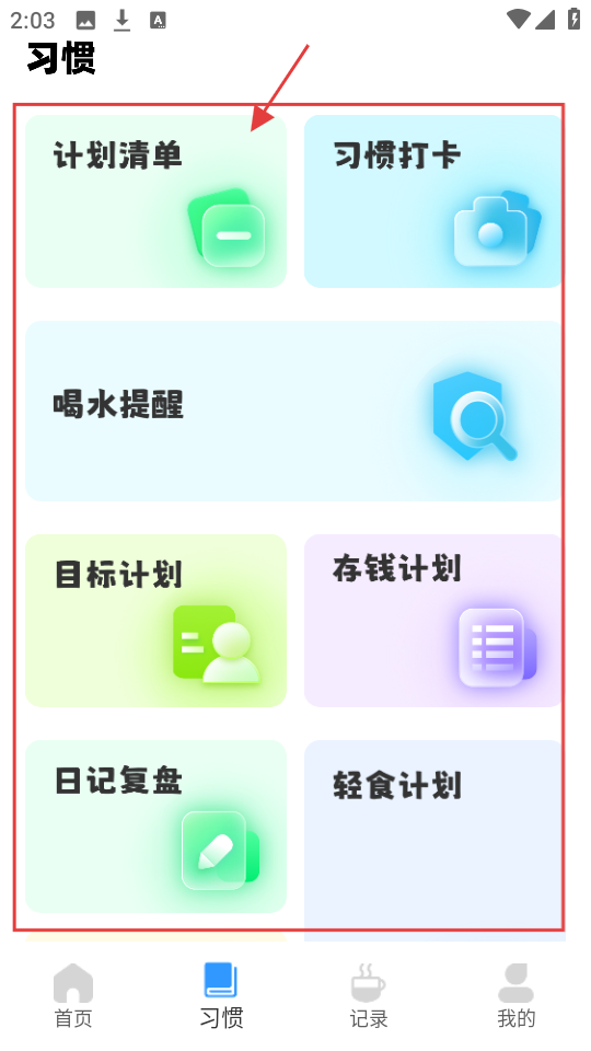 4、习惯页有【计划清单】【习惯打卡】等,选想养成的习惯功能,助力自己养成好的日常习惯。