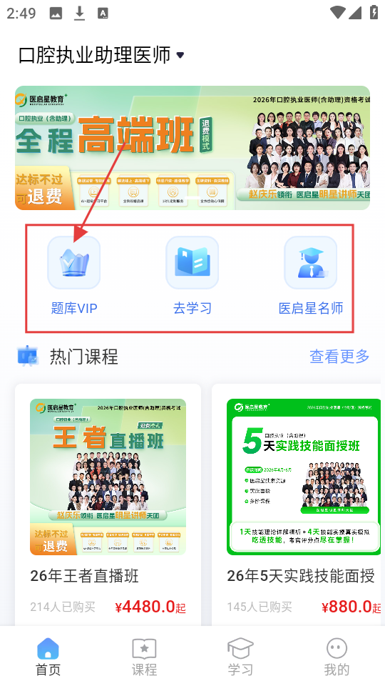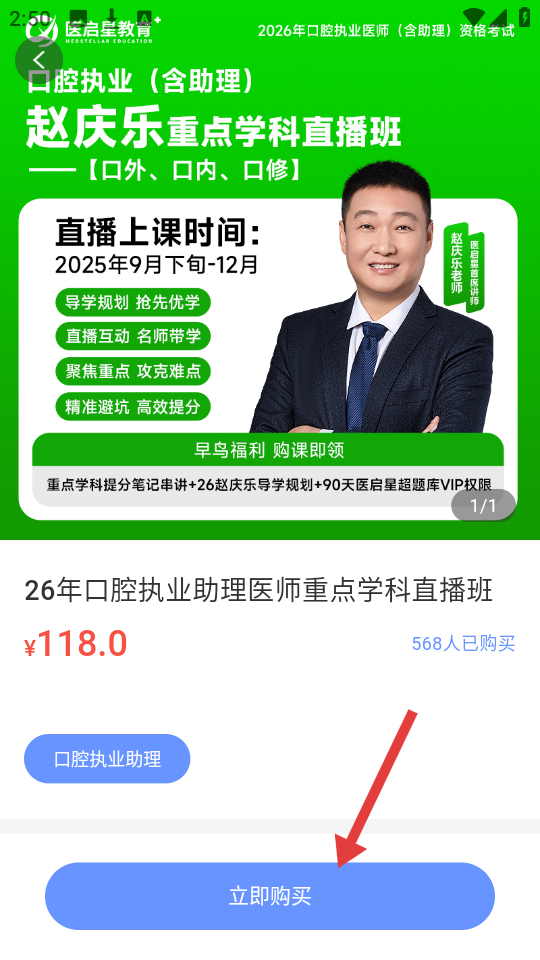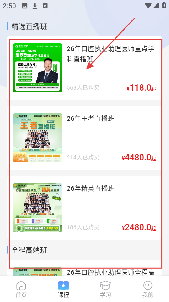 3、课程页有精选直播班,像【26年口腔执业助理医师重点学科直播班】,选感兴趣的课程。