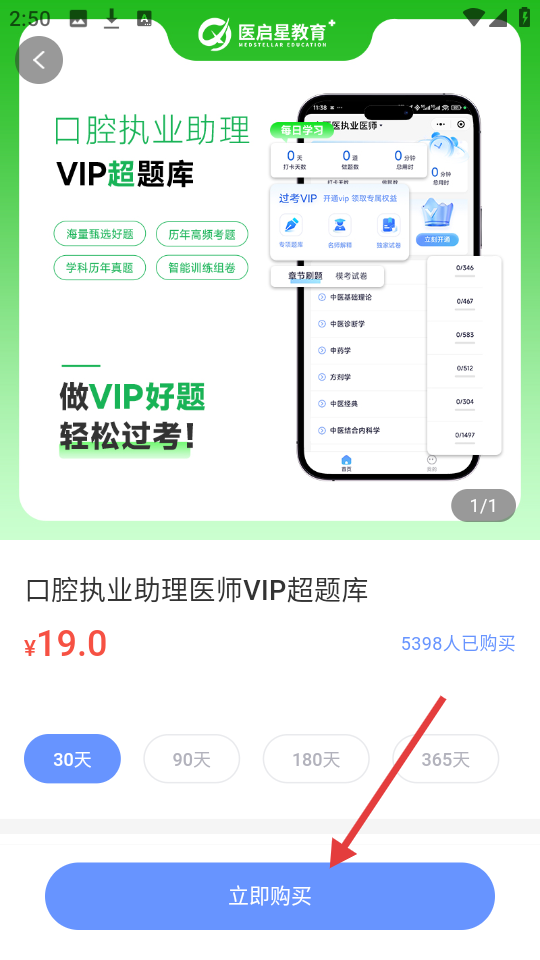 2、题库VIP页,看清楚超题库内容和价格,选合适时长,点【立即购买】,获取题库权限。