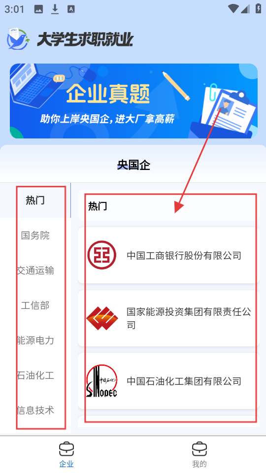 1、求职就业页面有热门央国企呢,像【中国工商银行股份有限公司】,要是想了解企业,点进去看看详情。