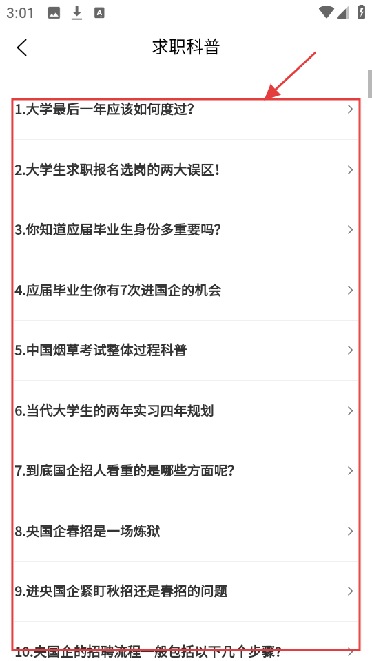 4、求职科普列表有超多实用问题,选自己感兴趣的,比如【大学最后一年应该如何度过?】,赶紧点进去学习吧。