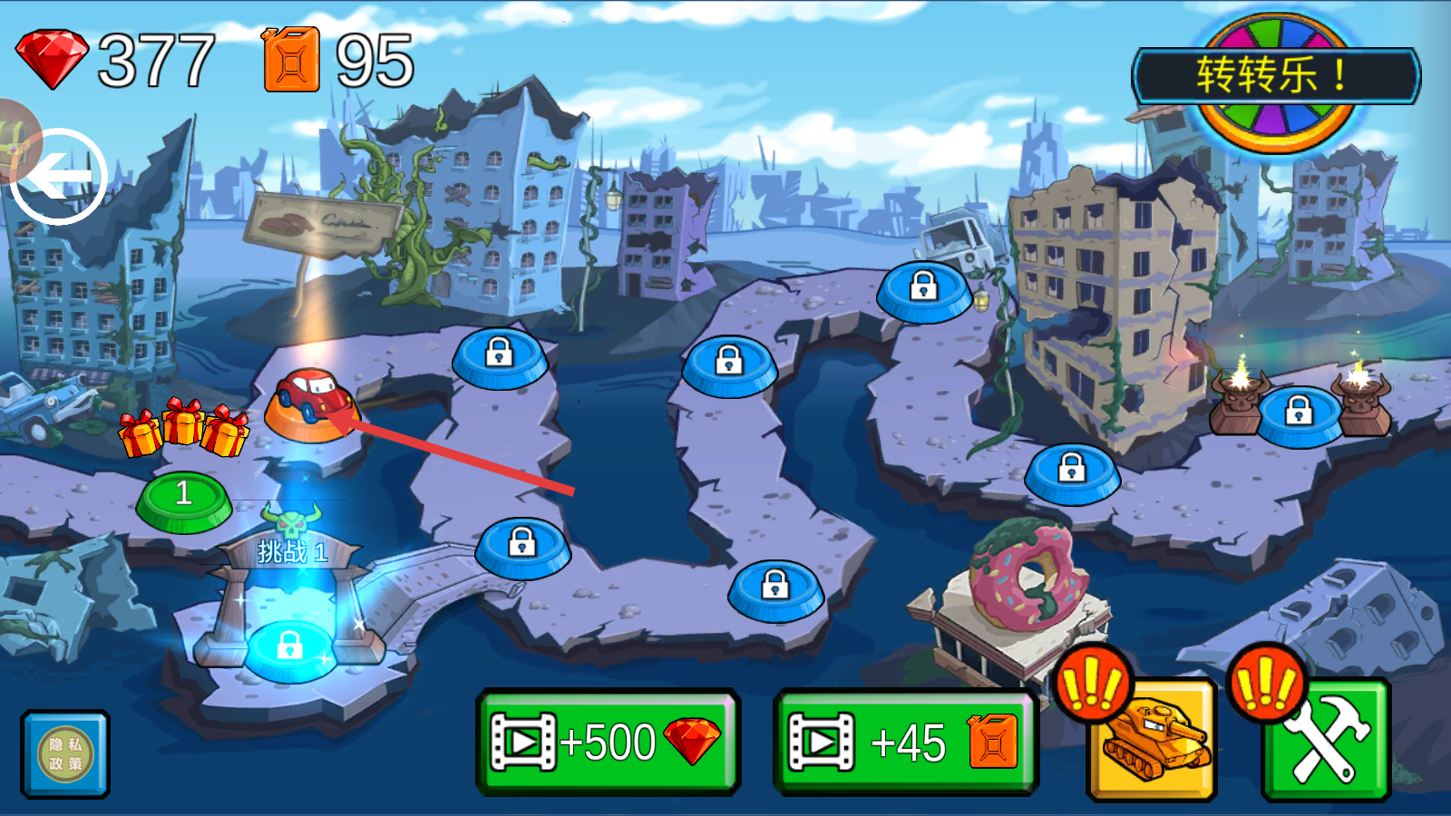 1、在关卡地图界面,选择可挑战的关卡,借助钻石、油等资源,点击对应关卡即可开启汽车闯关。
