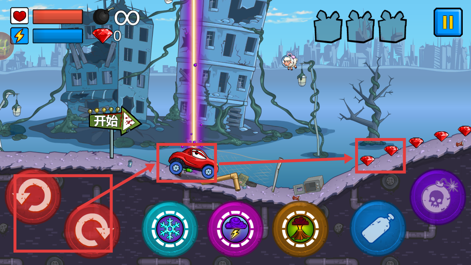 2、驾驶汽车时,通过左侧转向按钮操控方向,尽量收集沿途的红色钻石,以此积累资源。