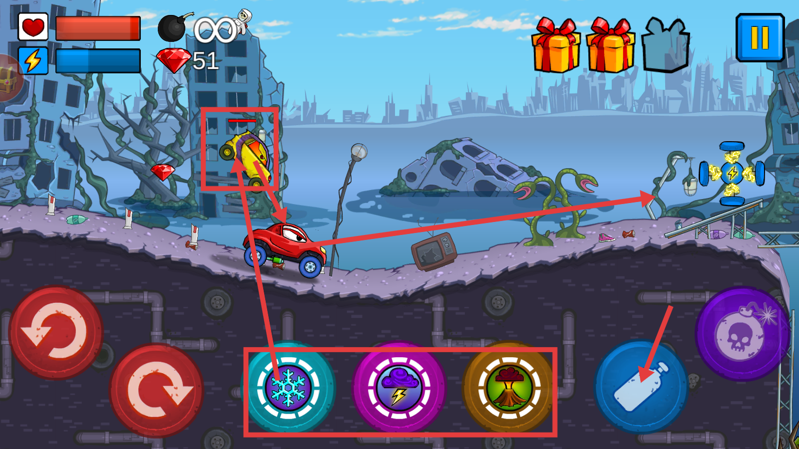 3、遇到黄色车辆等目标或障碍时,使用下方雪花、闪电等技能道具,辅助汽车顺利闯关。