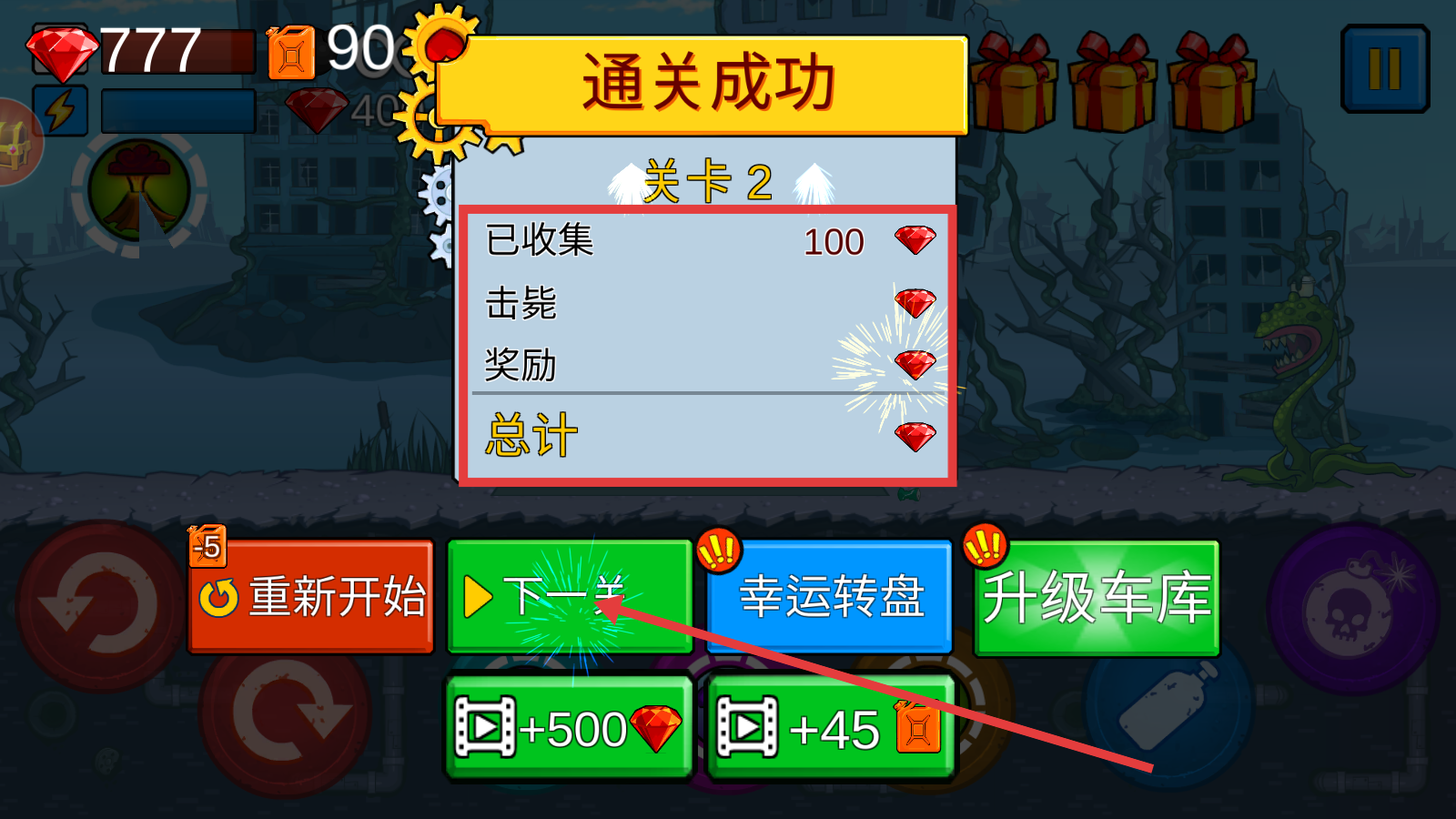 4、通关后界面显示【通关成功】,可点击【下一关】继续挑战,也能利用奖励升级车库或参与幸运转盘。