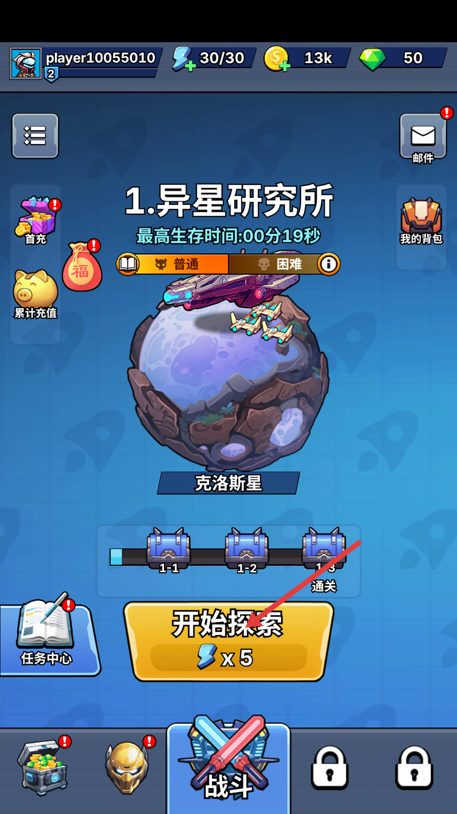 1、在【异星研究所】界面,点击黄色【开始探索】按钮,消耗5点资源即可进入克洛斯星的探索战斗。