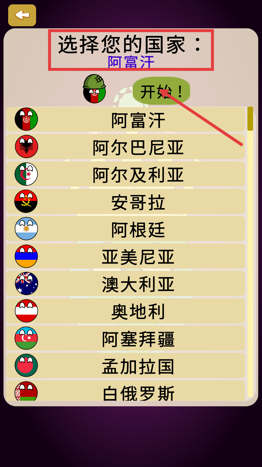 1、在国家选择界面,选定【阿富汗】后,点击绿色【开始!】按钮,进入对应国家的游戏经营阶段。