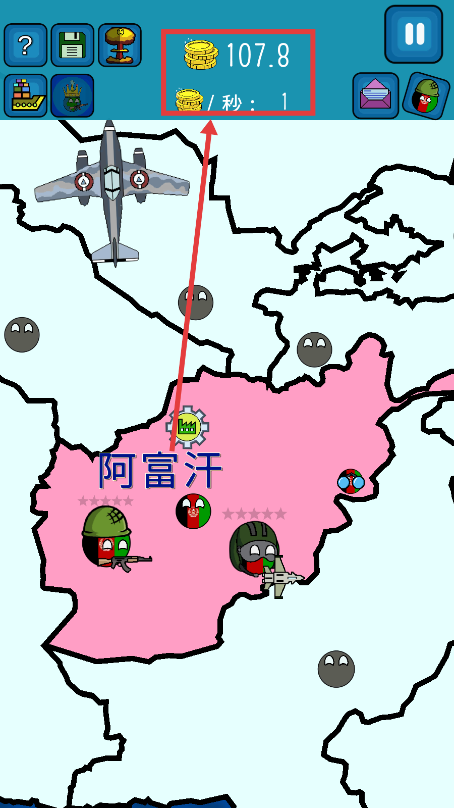 2、进入游戏地图界面,可看到【阿富汗】区域,通过经营积累金币,当前拥有金币【107.8】,每秒还能获得1金币。