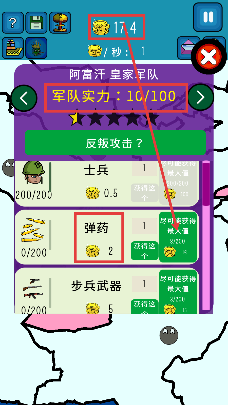 3、提升军队实力时,关注【军队实力-10/100】,用金币购置资源,像花费2金币获取1个【弹药】,逐步强化军队。