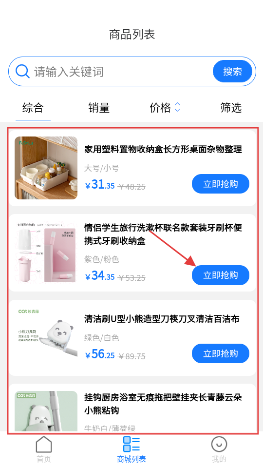 2、商品列表页有不少实用商品,看到喜欢的,点【立即抢购】,就能进商品详情页啦。
