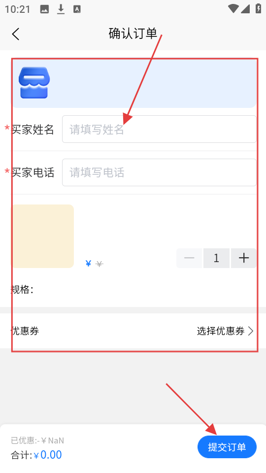 4、确认订单页,填好买家姓名、电话,选优惠券,最后点【提交订单】,就能完成购买咯。