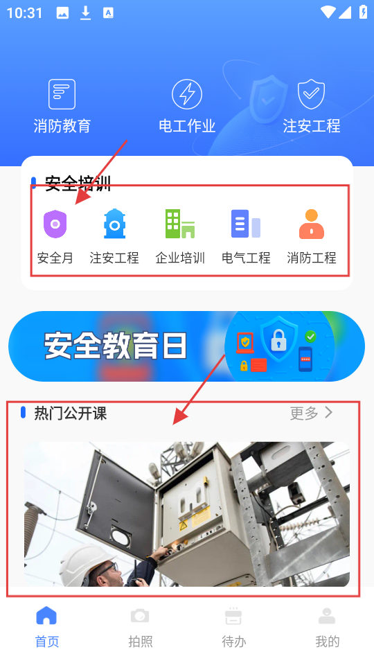 1、首页有【消防教育】【电工作业】等分类,还有安全培训和热门公开课,可根据需求选择学习。