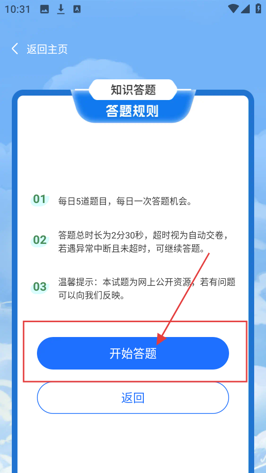 2、知识答题页有规则,每日5道题,时长2分30秒,看完规则,快点击【开始答题】挑战吧。
