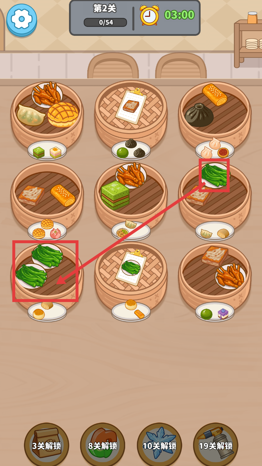 2、进入第2关后,快速寻找并点击相同的美食(如绿色蔬菜),进行配对消除。