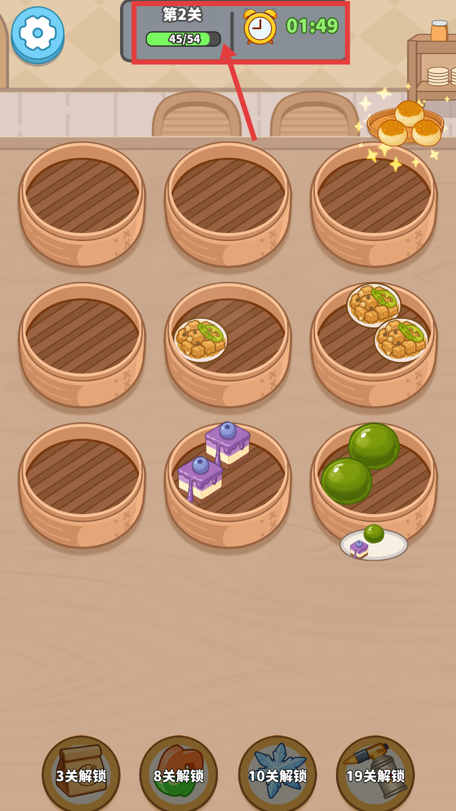 3、消除过程中,留意上方进度条和计时器,在限时内持续消除美食,尽快达成目标进度。
