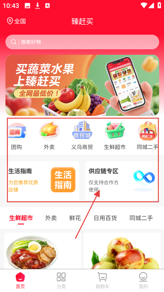 1、首页有【团购】【外卖】等功能,还有生活指南和供应链专区,想买东西从这儿选入口超方便。