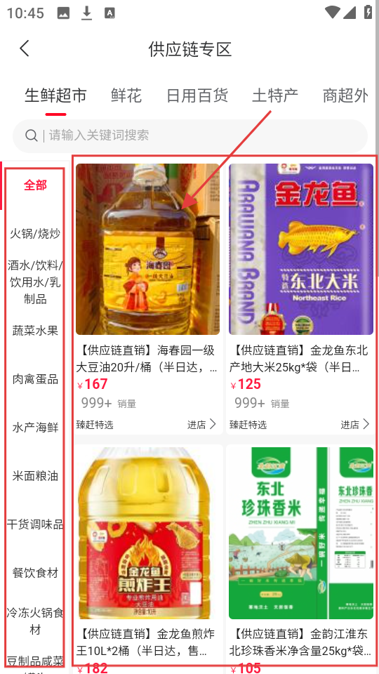 2、供应链专区有生鲜超市等分类,好多商品呢,看中想要的,点进去看详细信息。