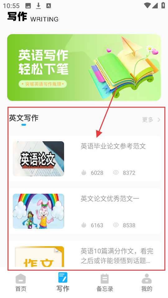 4、写作页有英文写作相关范文,如【英语毕业论文参考范文】,写作文没思路就来这看看。