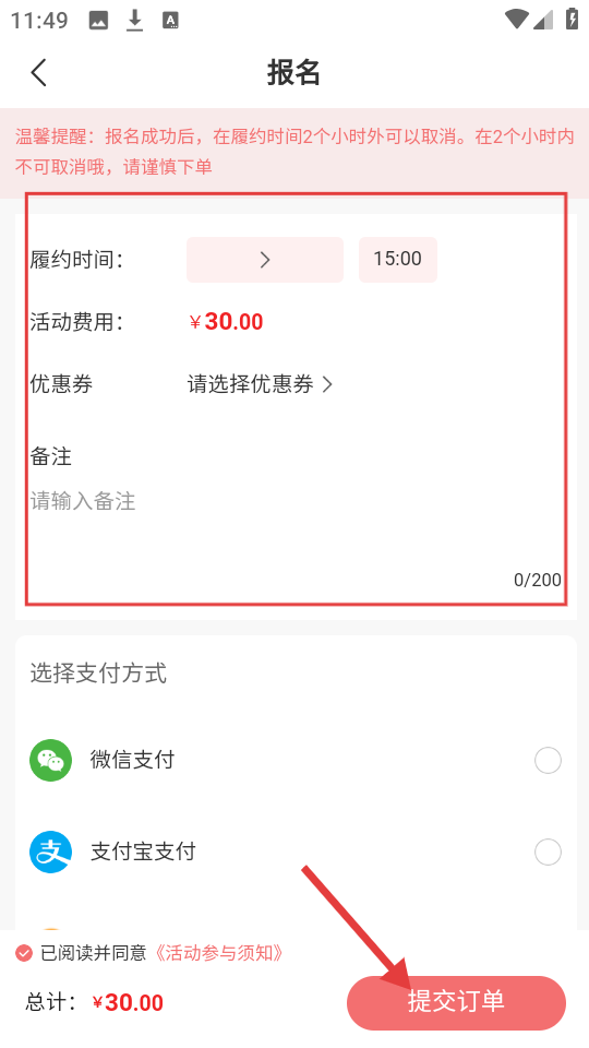 4、报名页选履约时间、支付方式,填好备注,点【提交订单】,就能完成活动报名啦。