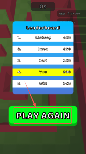4、最后,游戏结束后,点击“PLAY AGAIN”按钮再次参与游戏或查看排行榜。