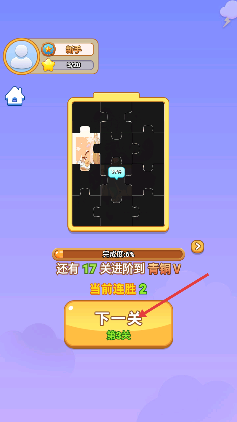 4、成功通关【第3关】后,获得【3-连胜】奖励,点击【前往拼图】按钮,继续推进拼图的解锁进度。