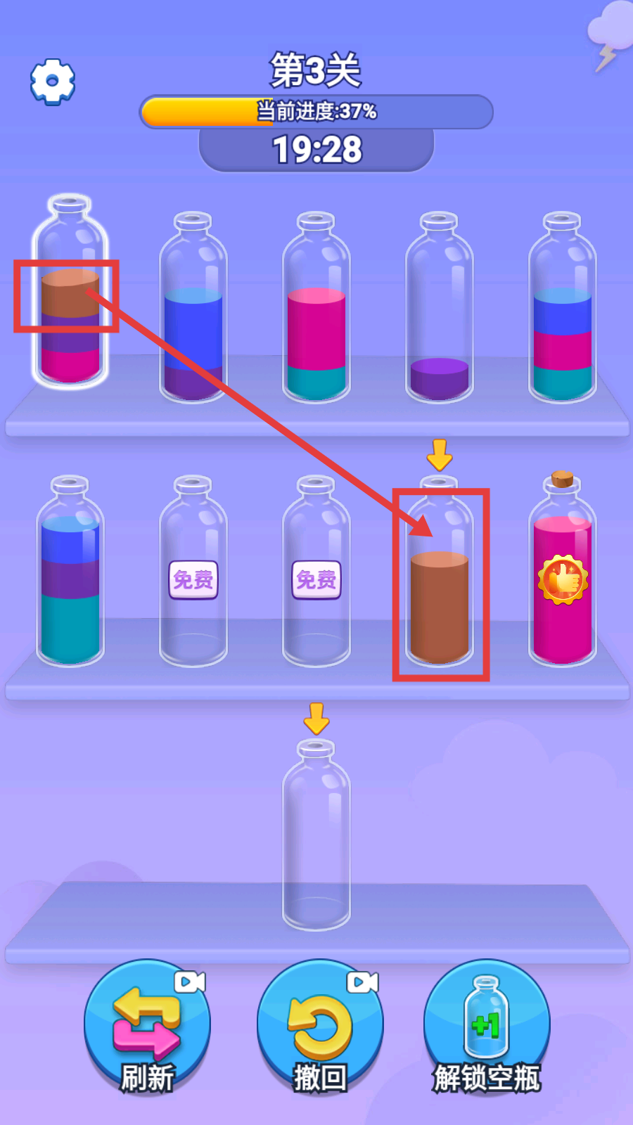 2、进入【第3关】,先将含棕色液体的瓶子,把棕色液体倒入对应空瓶,开启颜色分类第一步操作。
