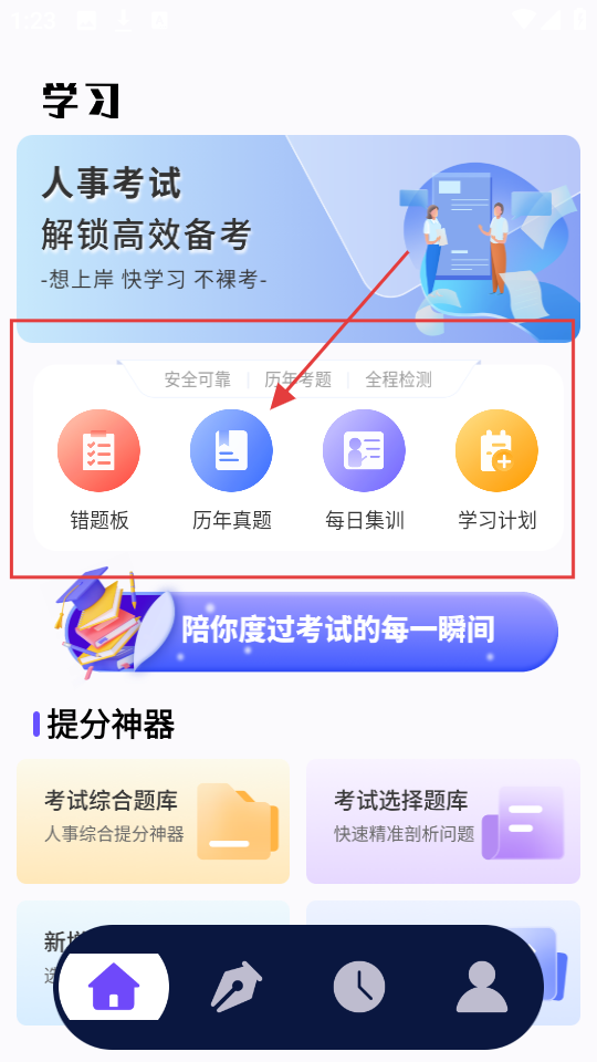 1、学习页有【错题板】【历年真题】等功能,想刷真题,点【历年真题】,开启真题练习超方便。
