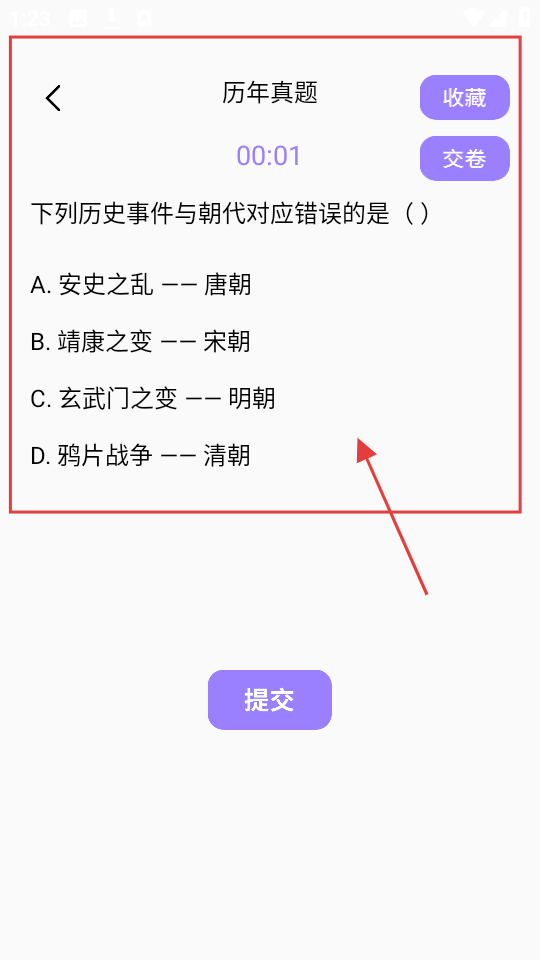2、进入历年真题页,认真答题,做完点【提交】,检验学习成果。