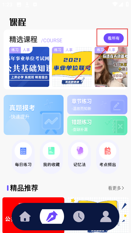 3、课程页有精选课程,点【看所有】,能浏览更多课程,挑选适合自己的课程学习哦。