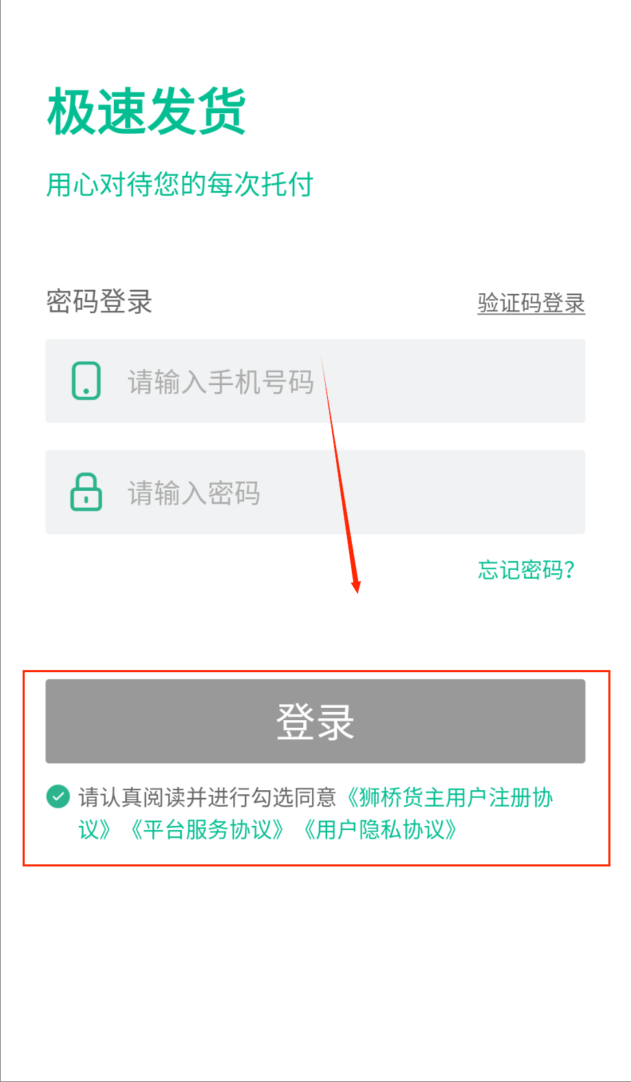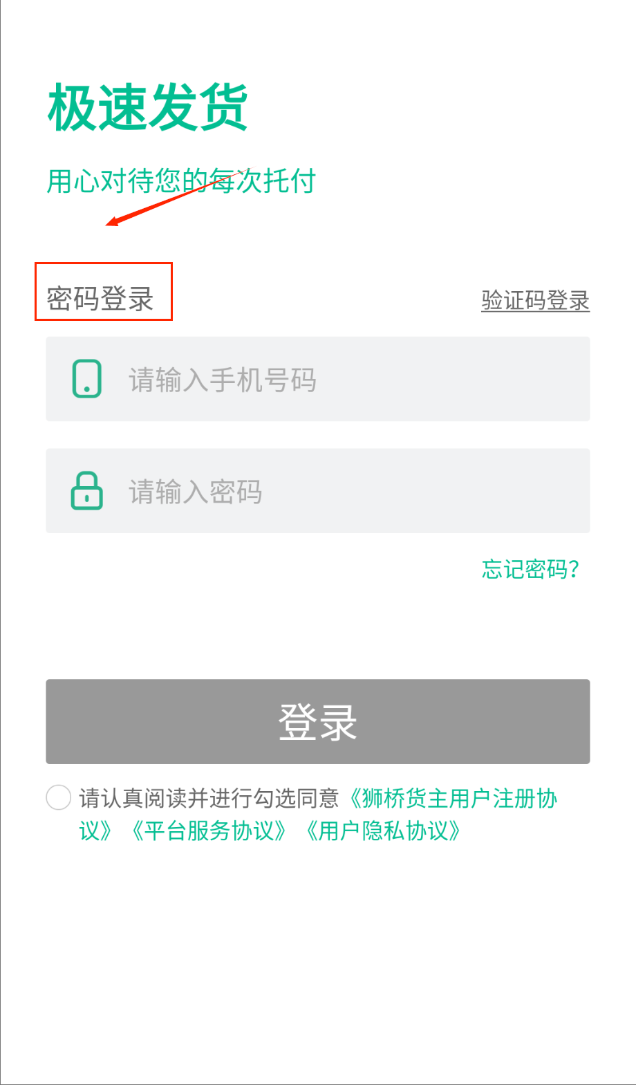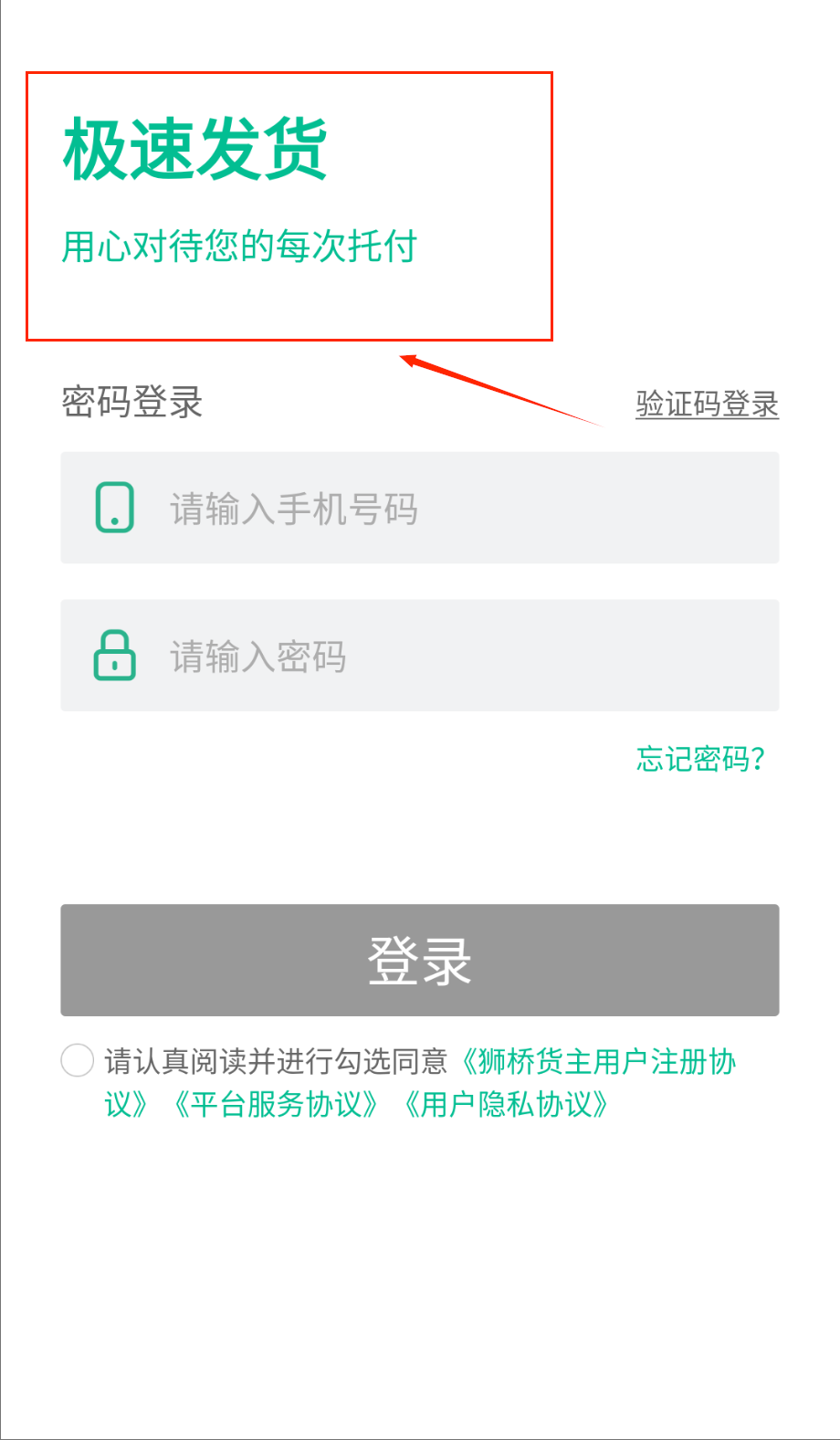 1、 打开狮桥货主,首先映入眼帘的是写着“极速发货 用心对待您的每次托付”的亲切页面呢,在这里咱们可以选择“验证码登录”或“密码登录”。