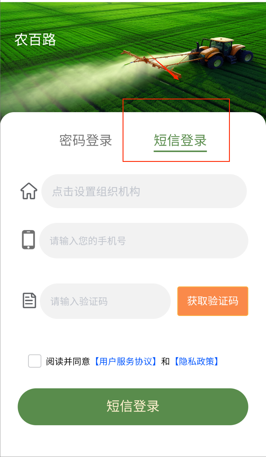 1、 短信登录超简单呢,打开软件看到绿色农田背景和顶部4:04时间显示,选“短信登录”方式(下面有绿下划线)。