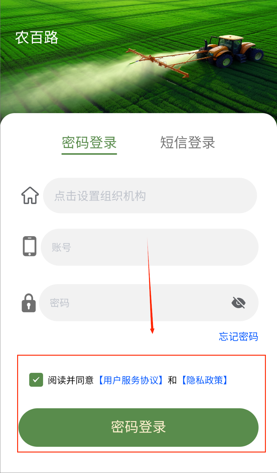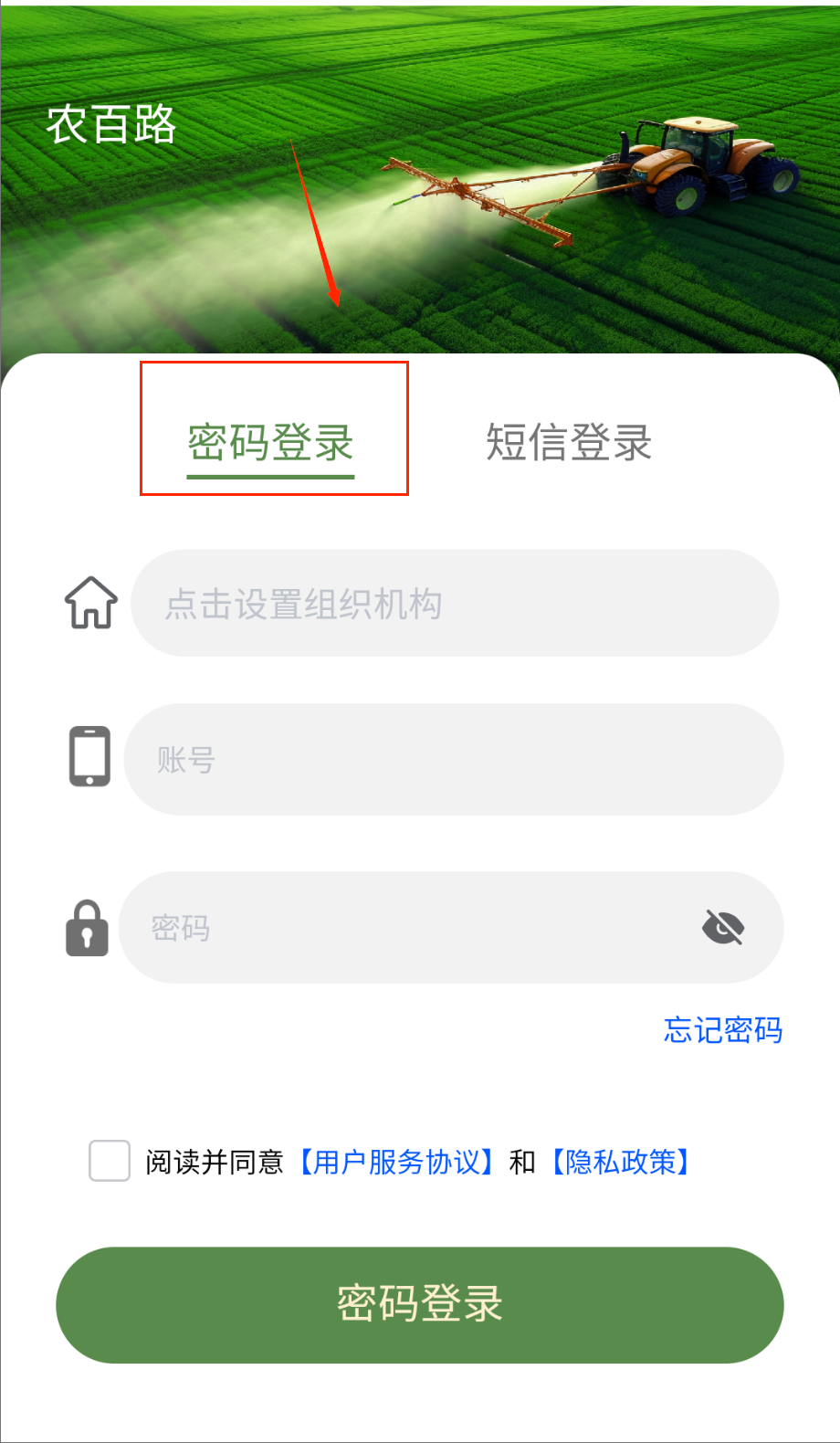 2、 密码登录也很方便哟,在登录页选“密码登录”标签,先点“点击设置组织机构”选单位,在“账号”框填注册号。