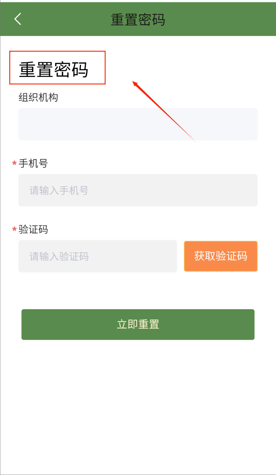 3、 找回密码别着急呀,点登录页“忘记密码”跳转新页面,在“组织机构”框选注册单位,“手机号”栏填绑定号码,点“获取验证码”收短信填进框。