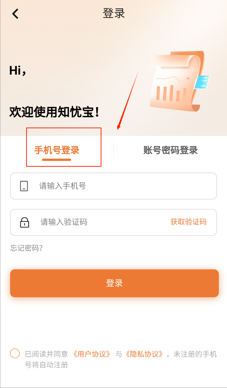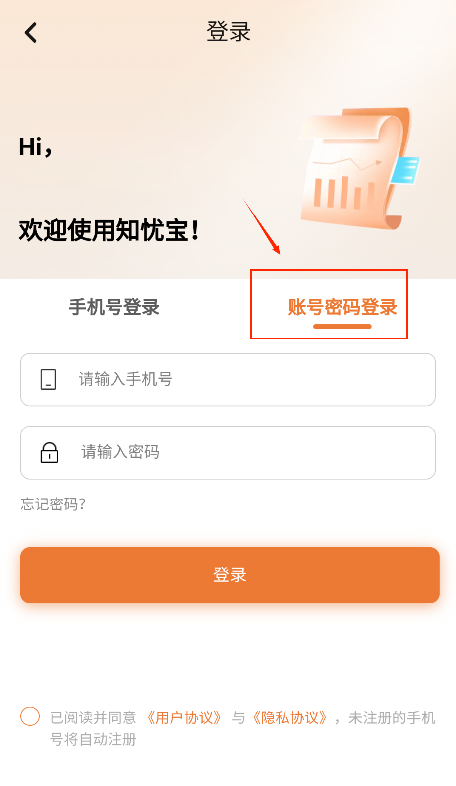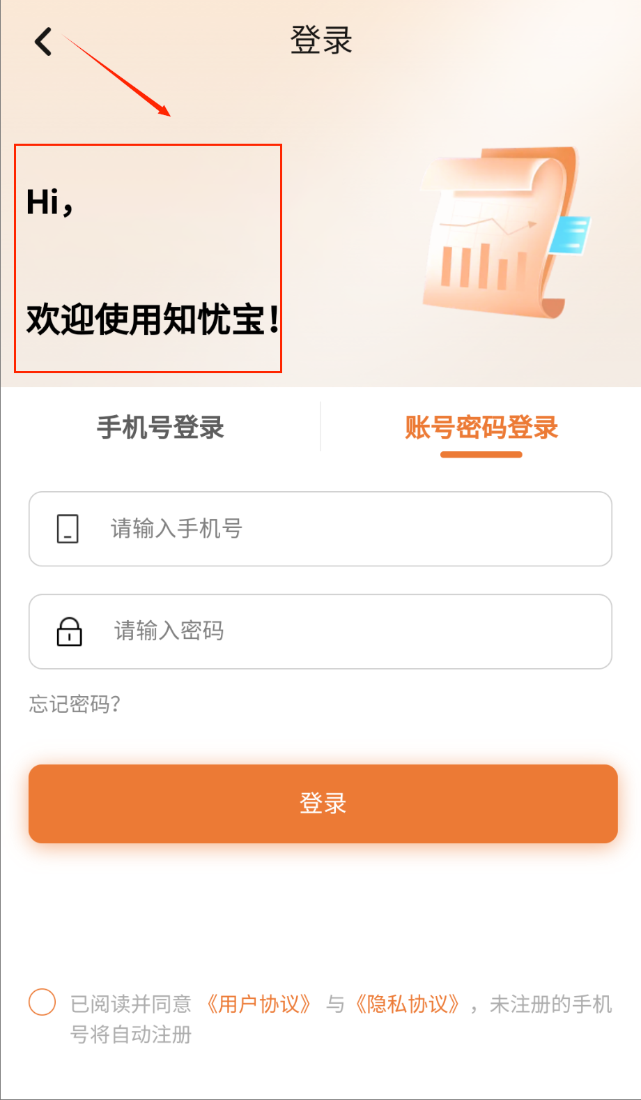 1、 打开软件就看到醒目的橙色登录界面啦,顶部显示着当前时间,中间有“Hi,欢迎使用知忧宝!”的问候语,右侧还有个报表小图标呢。