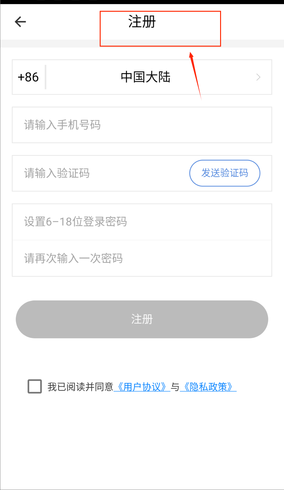 1、 注册新账号很简单呢,打开软件点击顶部“注册”按钮进入页面,在手机号区域默认显示+86中国大陆区号(可手动更改)。