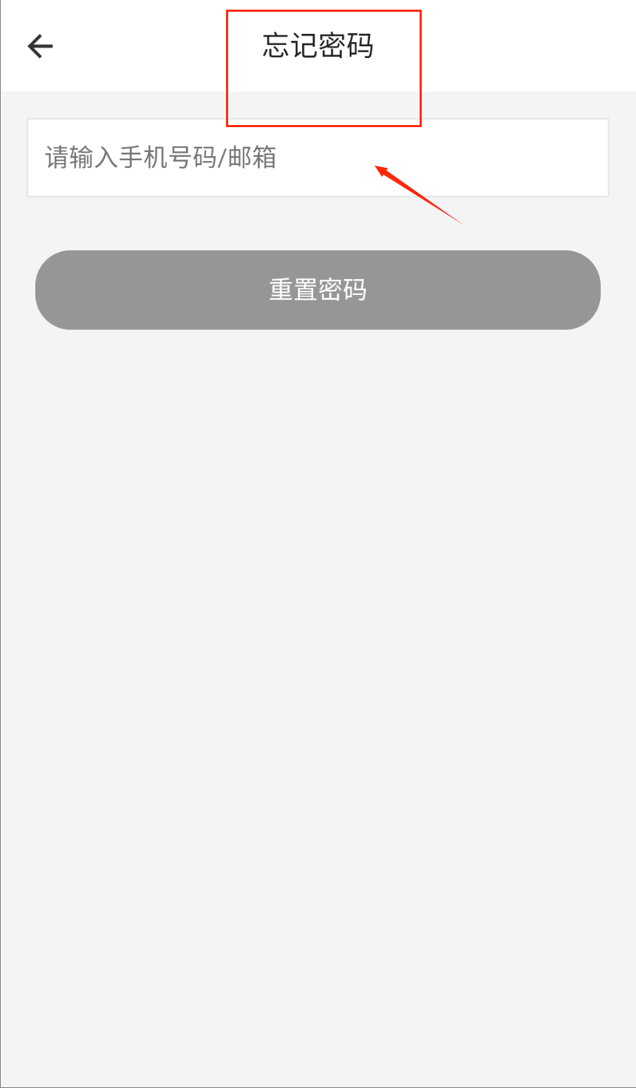 2、 找回密码别着急呀,在登录页点蓝色“忘记密码?”跳转新界面,顶部有返回箭头和“忘记密码”标题,在白色输入框填写注册时的手机号。