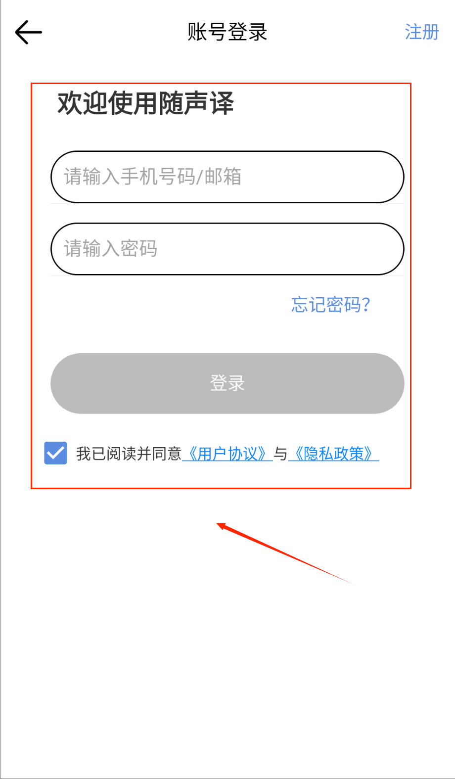 3、 账号登录超方便哟,打开APP看到“欢迎使用随声译”字样,第一个框填手机号或邮箱,第二个框输密码(可点眼睛图标检查)。