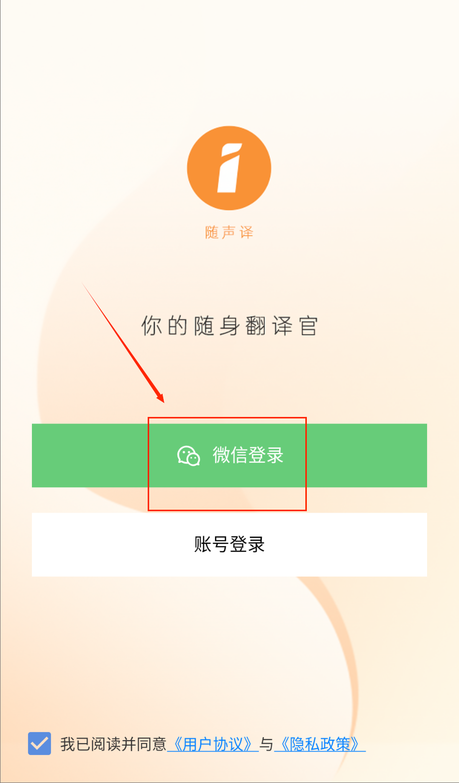 4、 微信登录更快捷呀,在启动页能看到橙色“随声译”图标和“你的随身翻译官”标语,直接点绿色“微信登录”按钮授权。