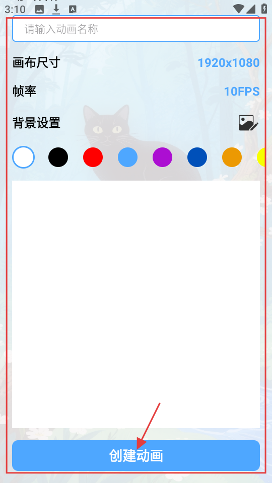 2、动画制作设置页,输入动画名称,选画布尺寸、帧率、背景色,点【创建动画】开始制作。