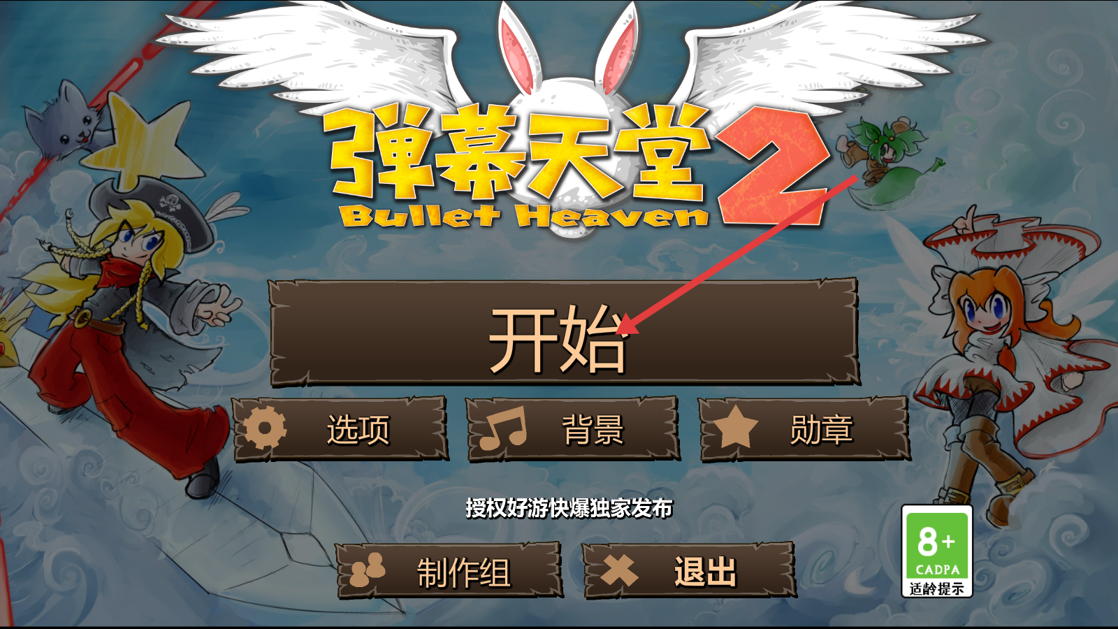 1、进入游戏后,点击【开始】按钮即可开启《Bullet-Heaven-2》的弹幕射击之旅,也可先在【选项】中调整设置。