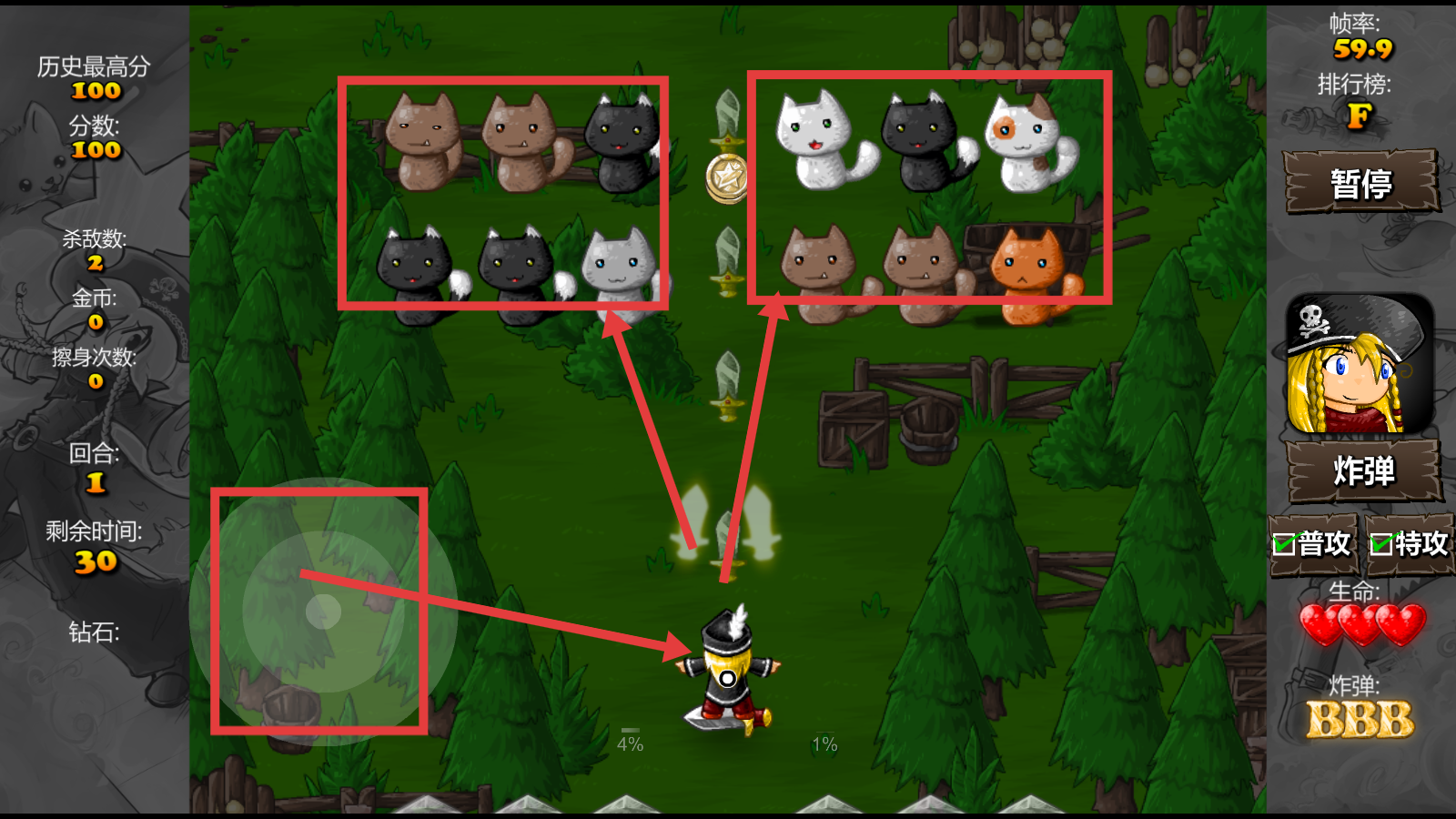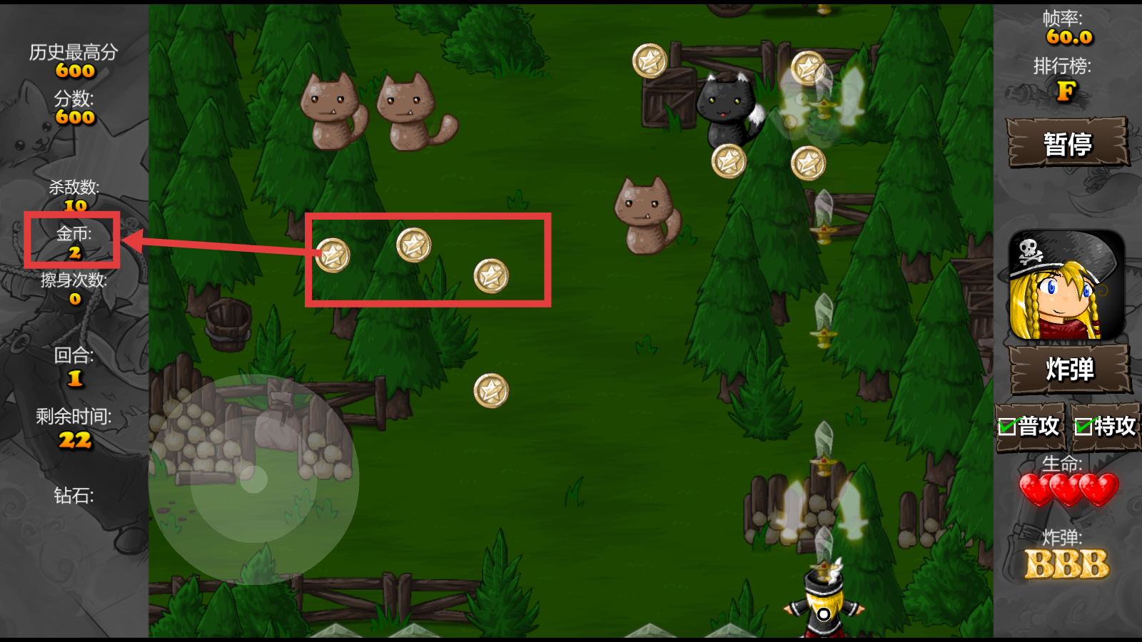 2、战斗时,通过左侧虚拟摇杆操控角色移动,躲避猫咪敌人的攻击,同时发射弹幕消灭它们,注意查看剩余时间等信息。