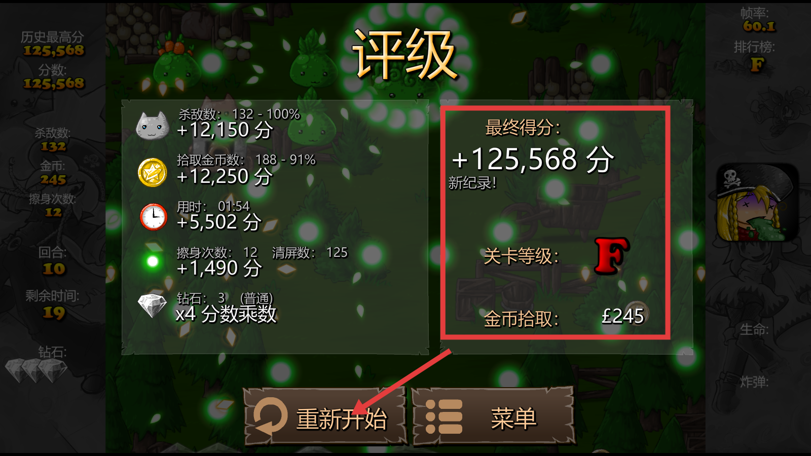 4、关卡结束后会显示评级,可查看杀敌数、金币拾取等得分项,若想挑战更高分数,点击【重新开始】再试一次。