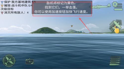 4、如何完成任务?根据目标提示击落4架黄色敌机,点击加速按钮可快速追击,保护我方基地。