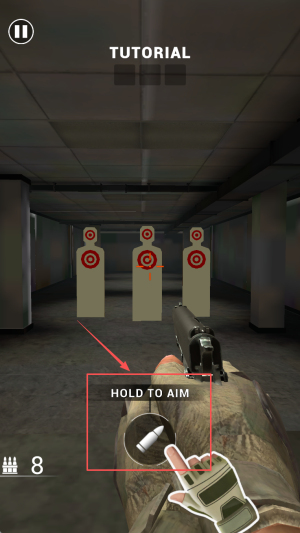 2、如何瞄准射击?在“TUTORIAL”界面按住“HOLD TO AIM”保持准星锁定敌人。