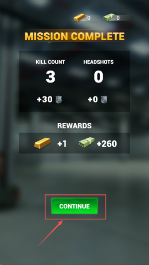 3、如何完成使命?消灭目标后查看“KILLCOUNT”与“HEADSHOTS”,点击“CONTINUE”领取奖励。