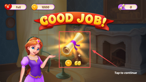 4、最后,完成关卡后,点击“Tap to continue”按钮继续游戏或查看奖励。