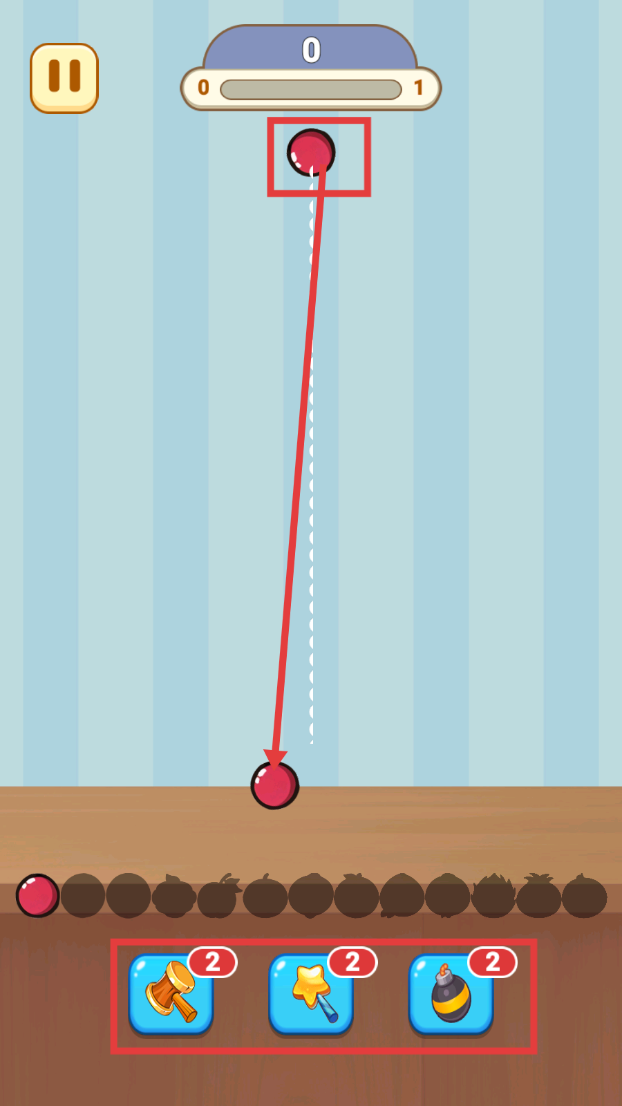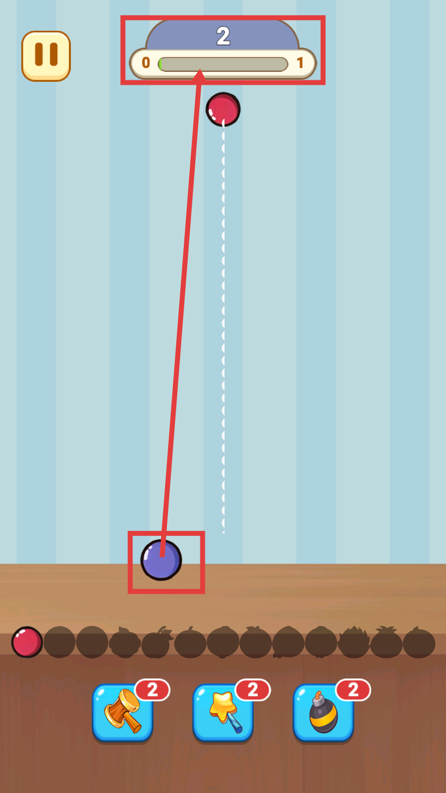 2、游玩中瞄准上方红球发射,下方【锤子】【星星棒】【炸弹】道具各有2次使用机会,可辅助通关。